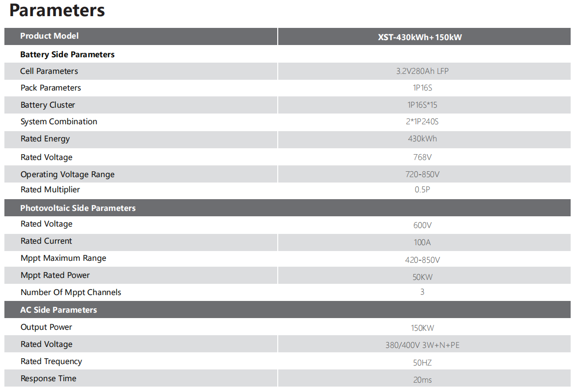 • Compact Mega-Storage: Delivers 430kWh of energy storage and 150kW of output power within a standard 10-foot container.