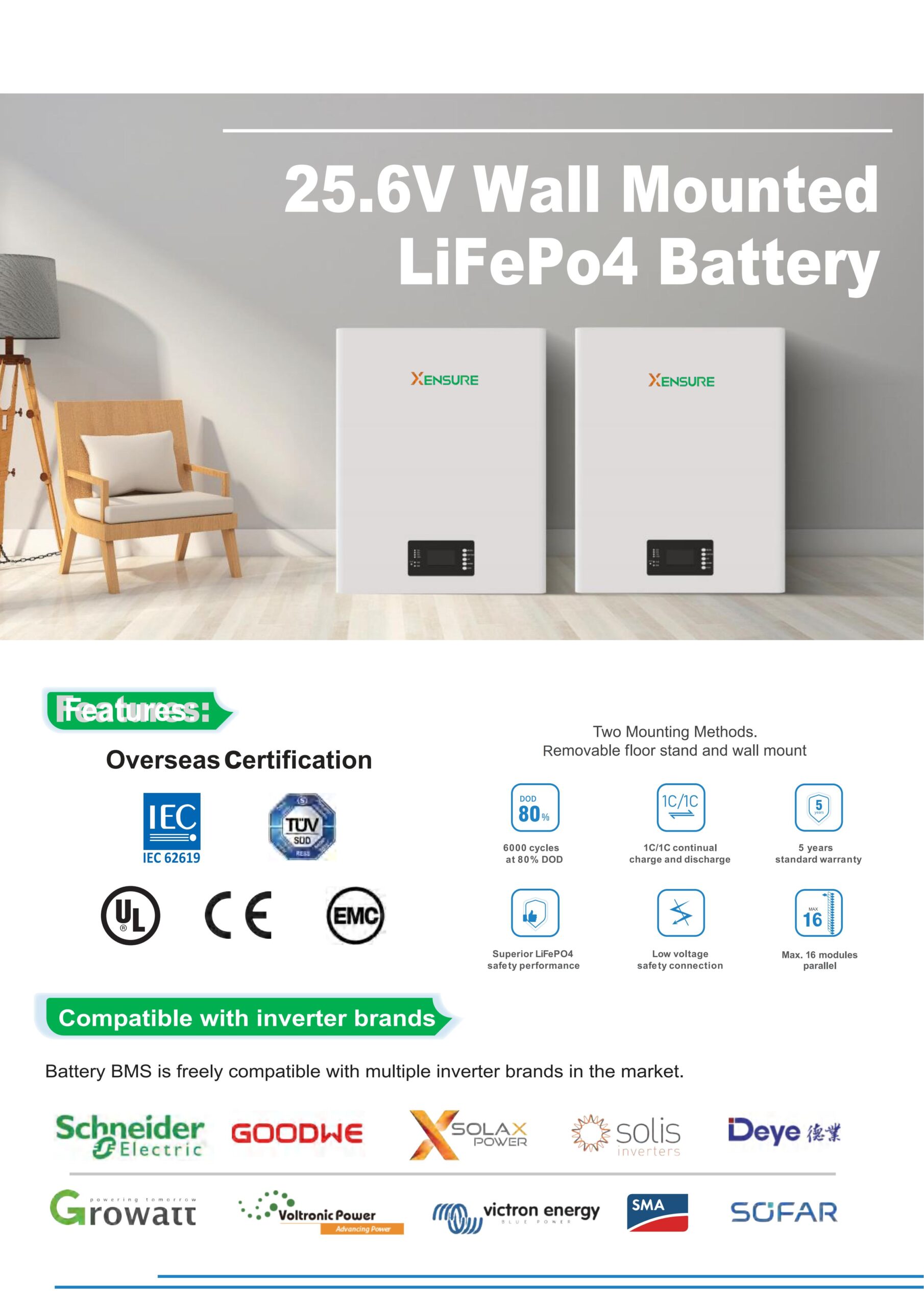 The ES25.6V-5.12KWH is a high-performance 25.6V wall-mounted energy storage solution designed for premium home energy independence. Built with Grade A LiFePO4 cells, it provides a safe and efficient 5.12kWh energy reservoir for 24V solar systems. Its sleek, compact design allows it to blend seamlessly into modern homes, while the advanced BMS ensures full protection and compatibility with industry-leading inverters. Whether for daily cycling or emergency backup, this battery offers a future-proof energy asset for smart green living.