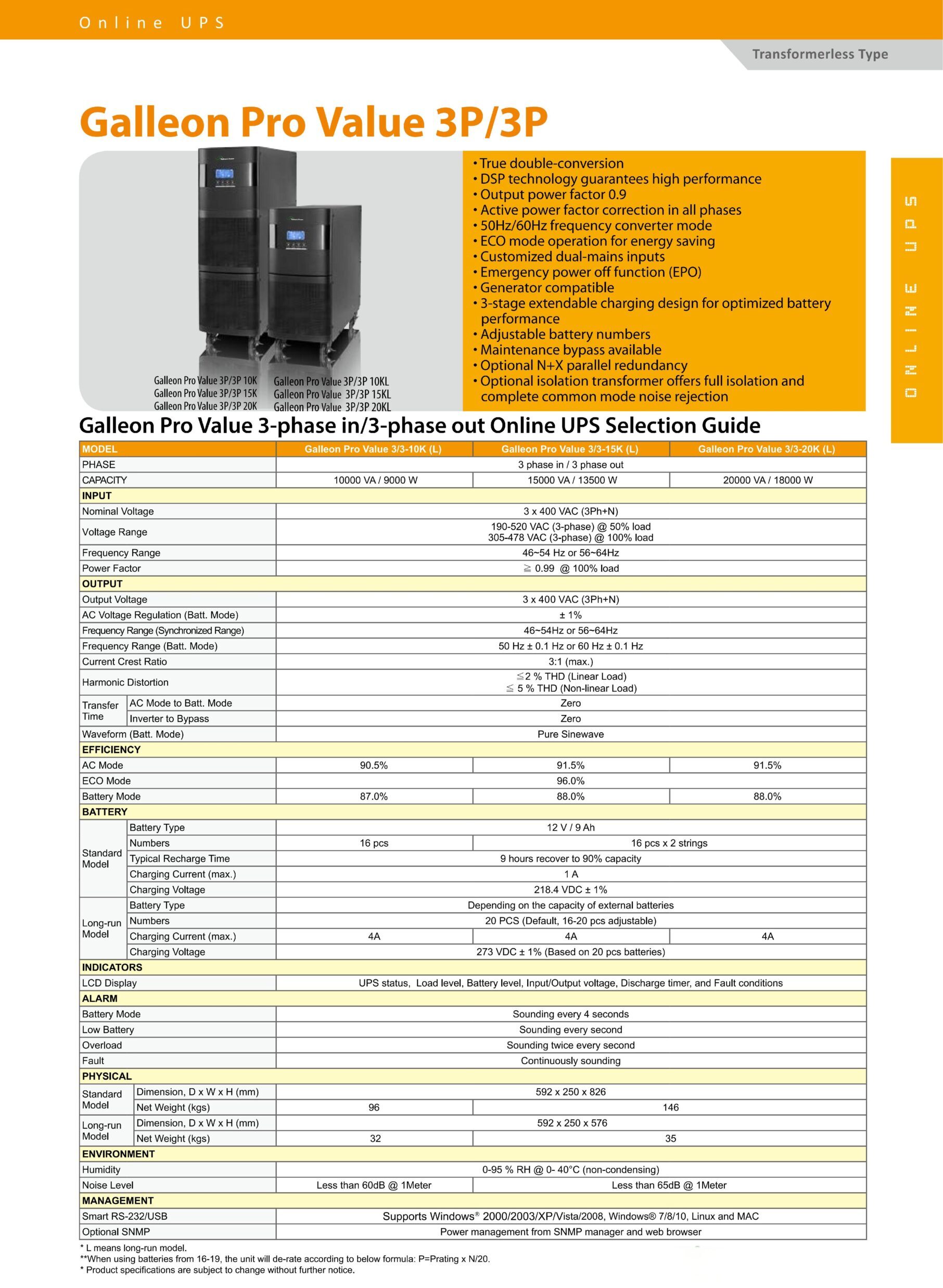 Customized dual-mains inputs Galleon Pro Value is the high-density version of the Galleon series of double-conversion online UPS with an output power factor 0.9. Ranging from 10KVA to20KVA, it's designed in a small footprintswith DSP technology and active input power factor correction design to ensure better output voltage conditions, power quality and power performance at all times. Its dual mains inputs willsecure the power reliability in a power fluctuation area.