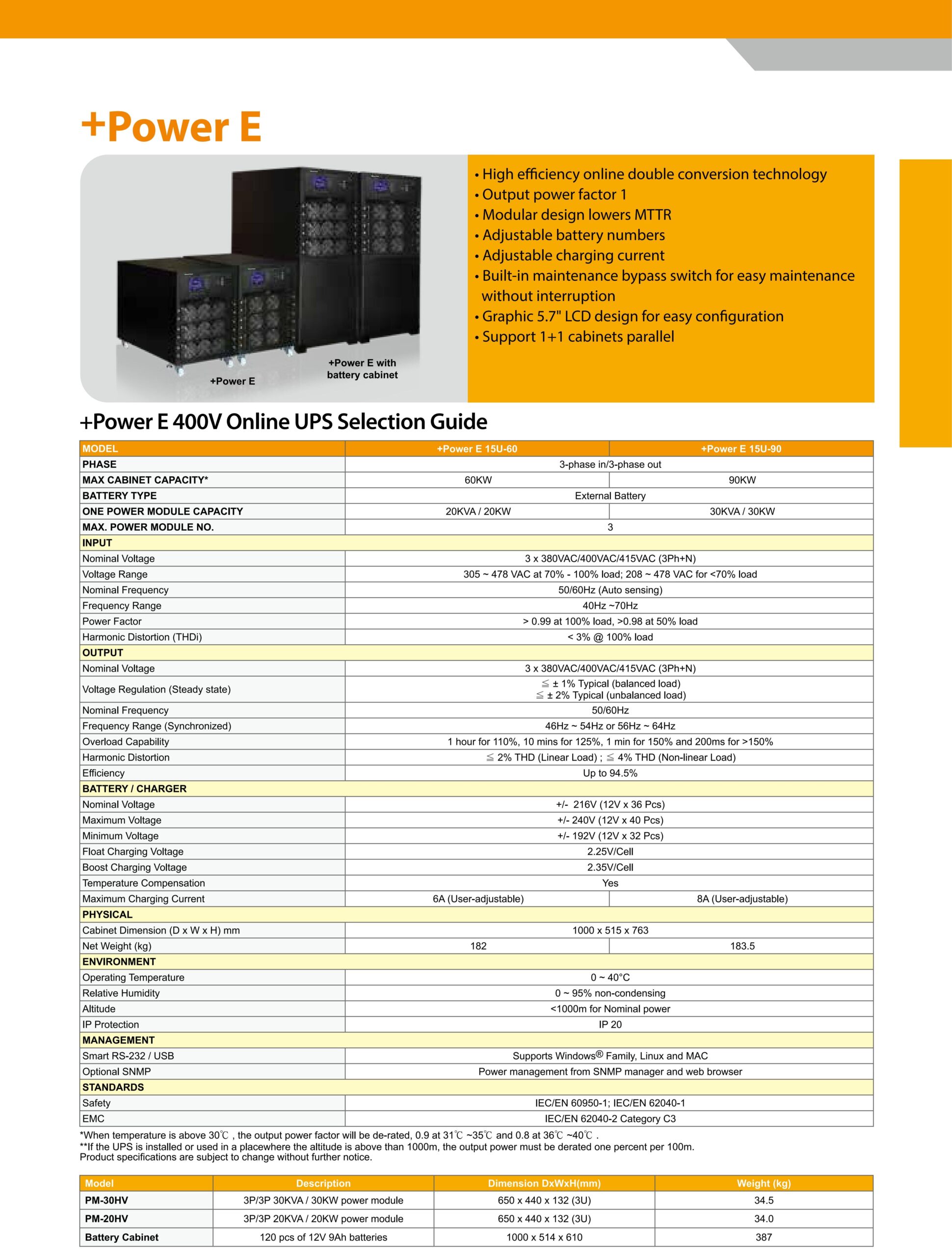 +Power E is a modular UPS system comprised of 1 to 3 modules of 30KW.