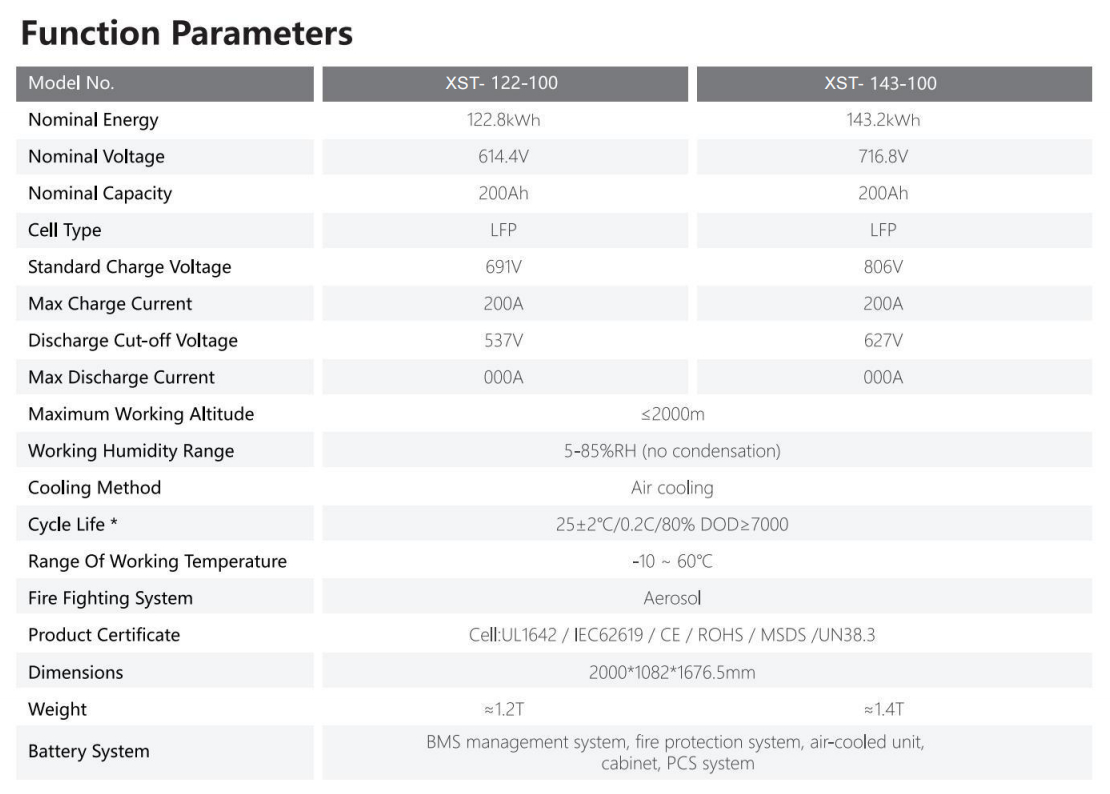 • Ultra-High Integrated Solution: Combines a 143.2kWh LiFePO4 battery system, 100kW PCS, BMS, fire protection, and air cooling into one cabinet.