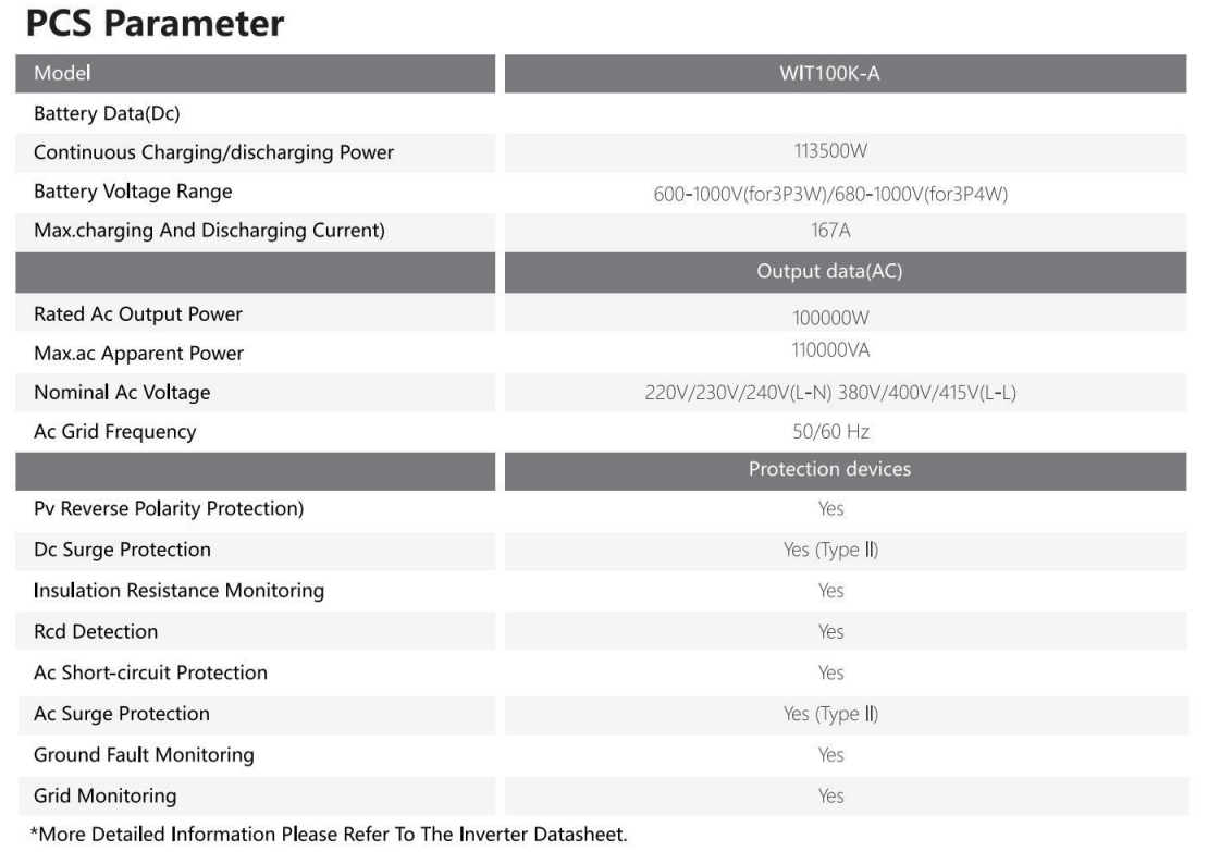 • Peak Conversion Efficiency: Features a WIT100K-A PCS with up to 98% efficiency and smart grid monitoring.