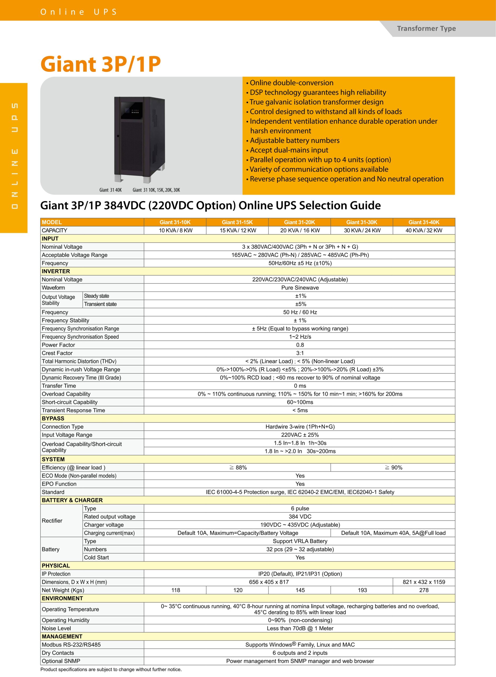 Giant Elite 3P/3P 10kVA-40kVA Industrial Online UPS