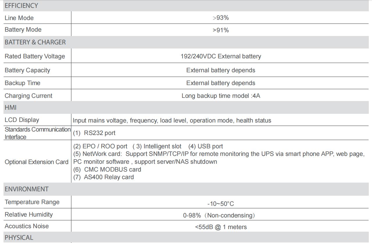 Intelligent Battery Management: Long-backup models support 192V or 240V DC voltages and 4A high-current charging to ensure rapid recovery.
